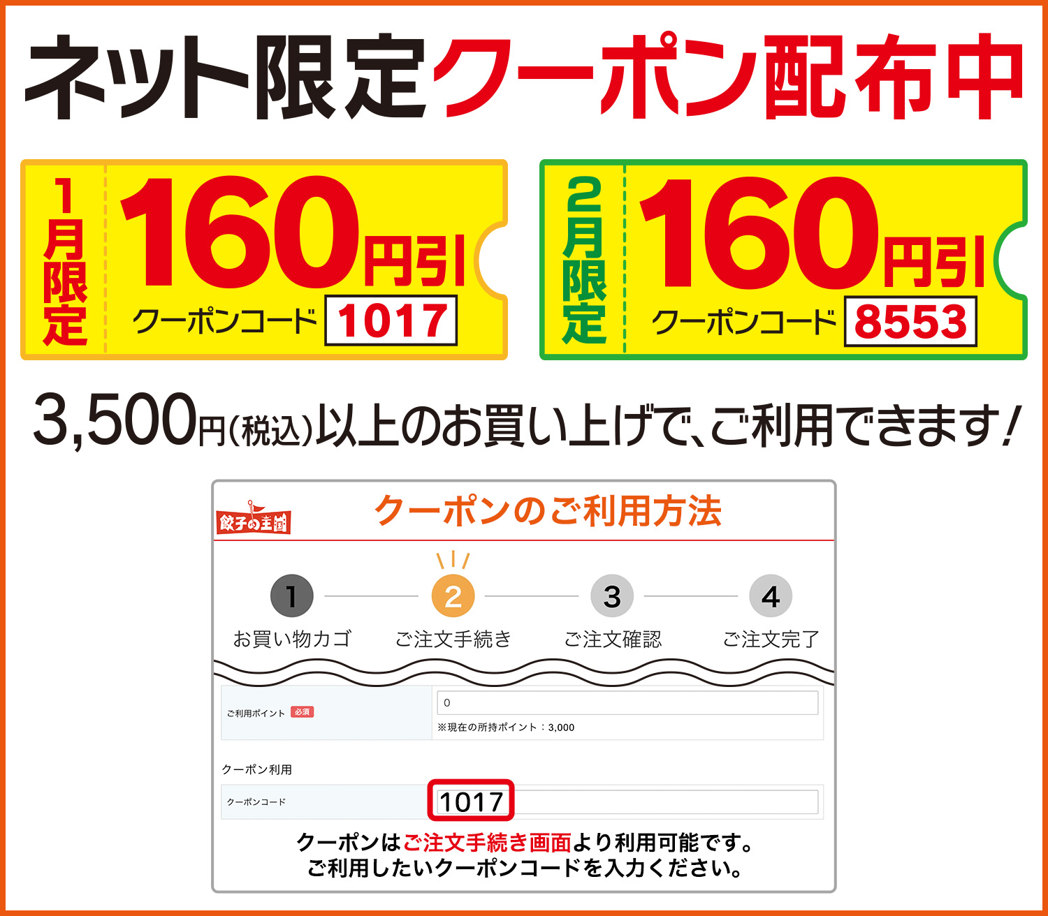 こちらはWEB注文限定ですがクーポンをご用意しました。 各クーポン1回ずつご利用できます。ご注文手続き画面のクーポン3,500円以上のお買い物でご利用ください。