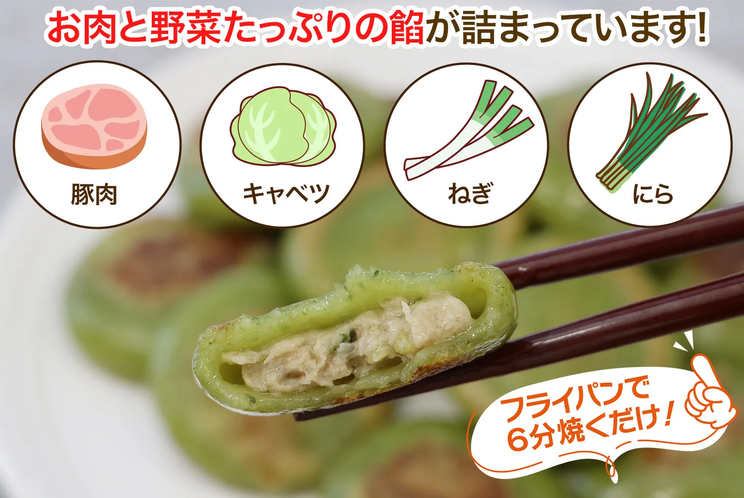 豚肉にねぎ、キャベツ、ごま油などを練り込んだ餡をほうれん草ペーストで色をつけた皮で包みました。 お好みで餃子のたれやマヨネーズをつけてお召し上がりください。