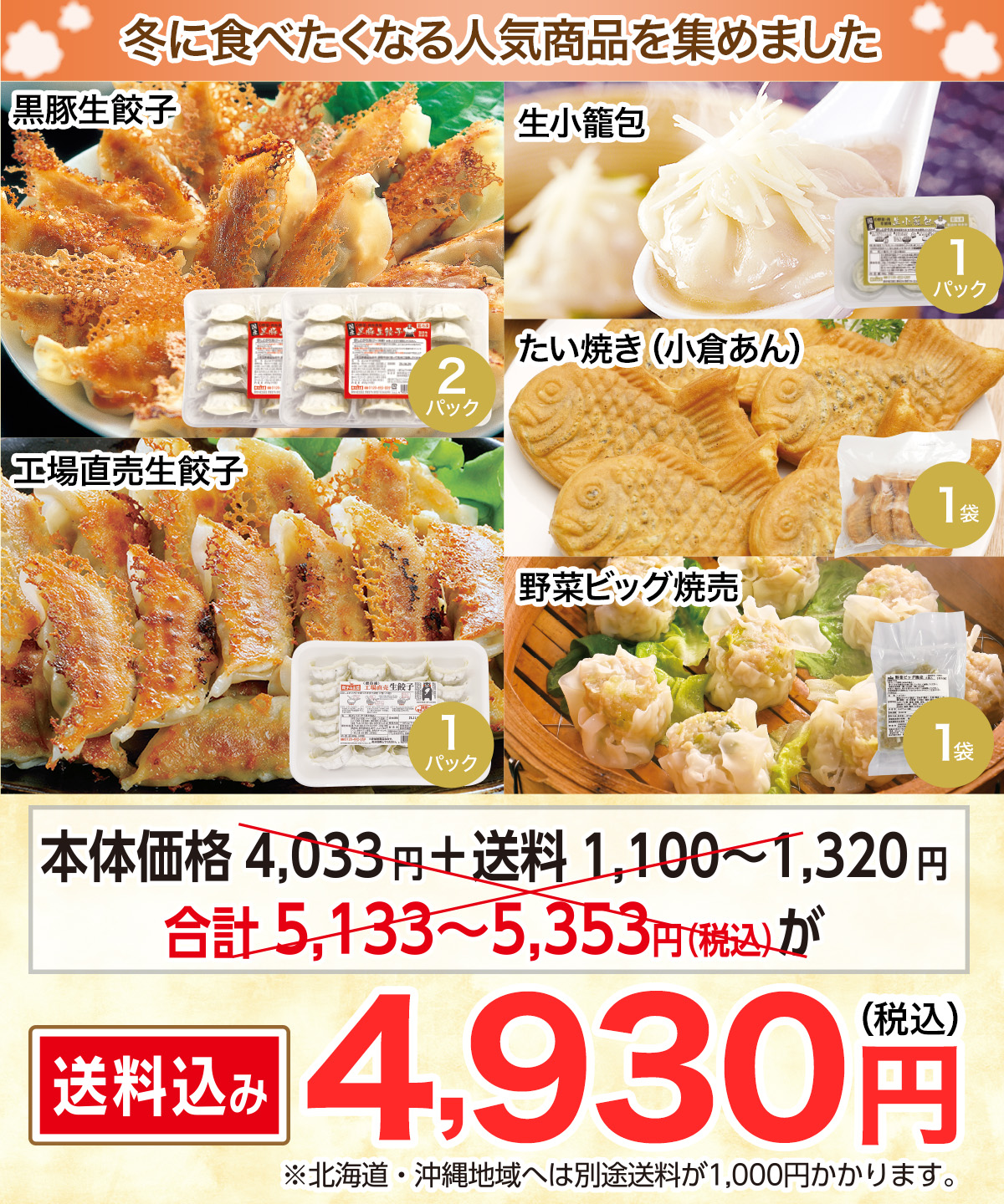 | 商品内容 | 冬のあったかセット【送料込】 セット内容:黒豚生餃子 30個(15個入×2パック)、工場直売生餃子 24個(24個入×1パック)、野菜がビッグ焼売 8個(8個入×1袋)生小籠包 6個(6個入×1パック)、たい焼き(小倉あん)5個(5個入×1袋)※餃子のタレは別売りです 購入はこちら |