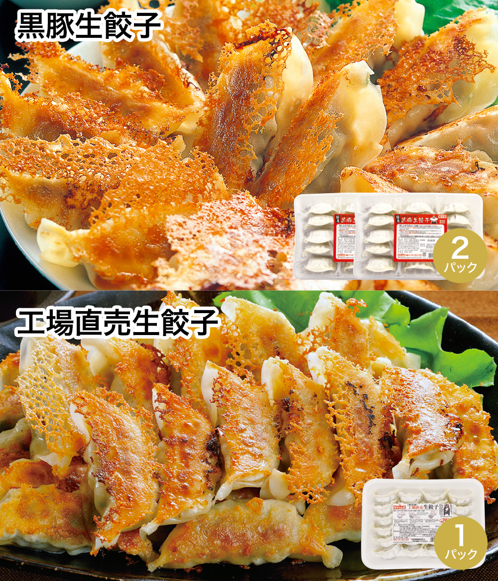 黒豚生餃子、工場直売生餃子はともに国産肉・野菜を100%使用。製造から全て自社工場で行なっているため安心・安全のおいしさをお届けします。